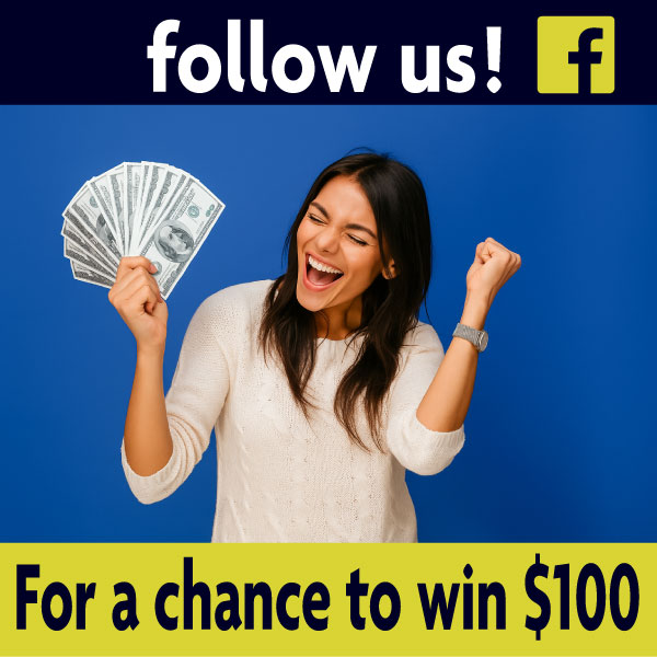 Follow us on Facebook for your chance to win $100! Just go to our page and hit the Like button. Once we reach 1000 followers, we will select a winner at random to win.